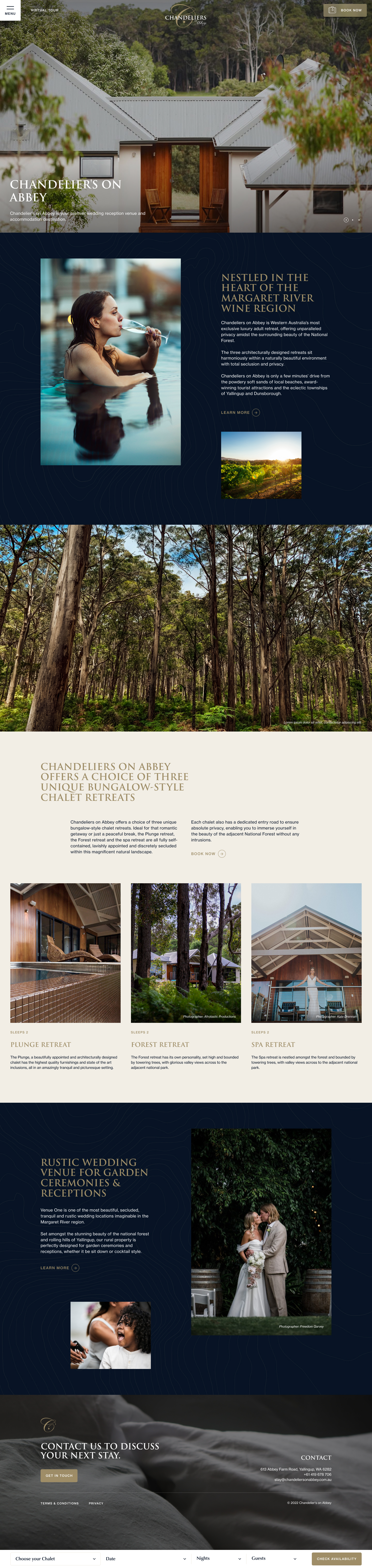 Nestled in the heart of the Margaret River wine region, you’ll find Western Australia’s most exclusive luxury retreat and event venue, Chandeliers on Abbey. Beautiful images and location deserved a beautiful website.